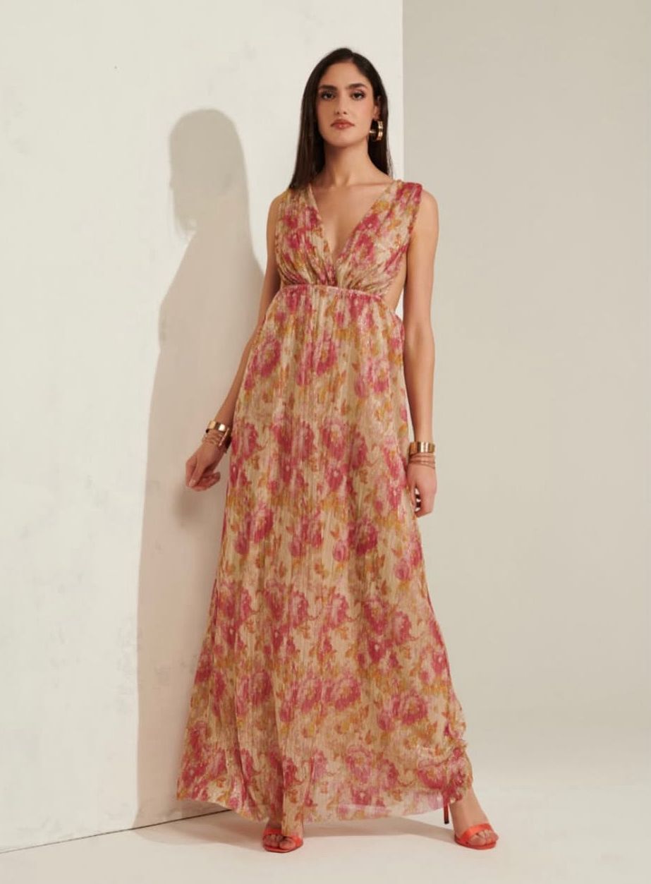 Firmato Je-nè, questo abito lungo esprime tutta la delicatezza e la femminilità tipiche del brand. Il tessuto leggero e impalpabile avvolge la figura con grazia, mentre la stampa floreale nei toni del rosa, cipria e oro crea un effetto romantico e luminoso.