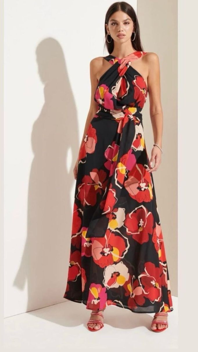 Modello con scollo incrociato all’americana e vita evidenziata da una fascia annodata sul davanti. Realizzato in tessuto leggero semi-trasparente con stampa maxi fiori nei toni del rosso, fucsia e giallo su base nera. Gonna ampia e fluida con taglio svasato. Foderato internamente fino al ginocchio.