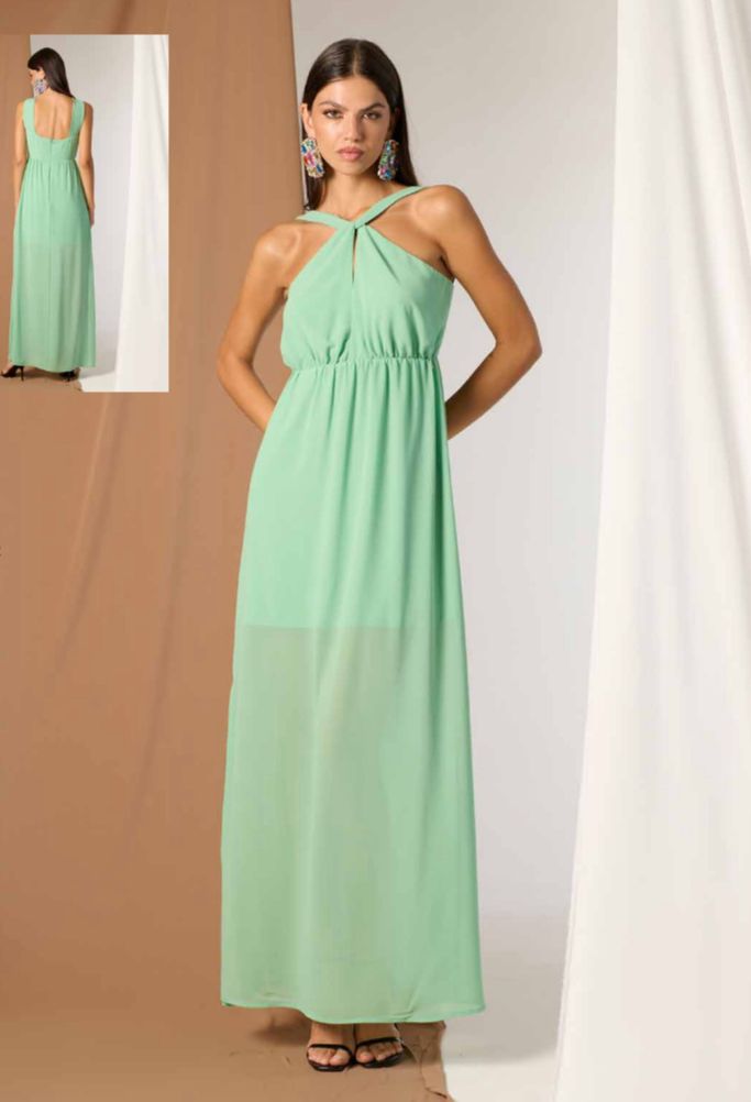 Fresco e femminile, questo abito lungo verde è perfetto per le giornate estive e le occasioni speciali. Caratterizzato da uno scollo incrociato con dettaglio annodato e apertura frontale, presenta una vita elasticizzata che definisce la silhouette. Il tessuto leggero e semi-trasparente dona movimento e leggerezza al look.