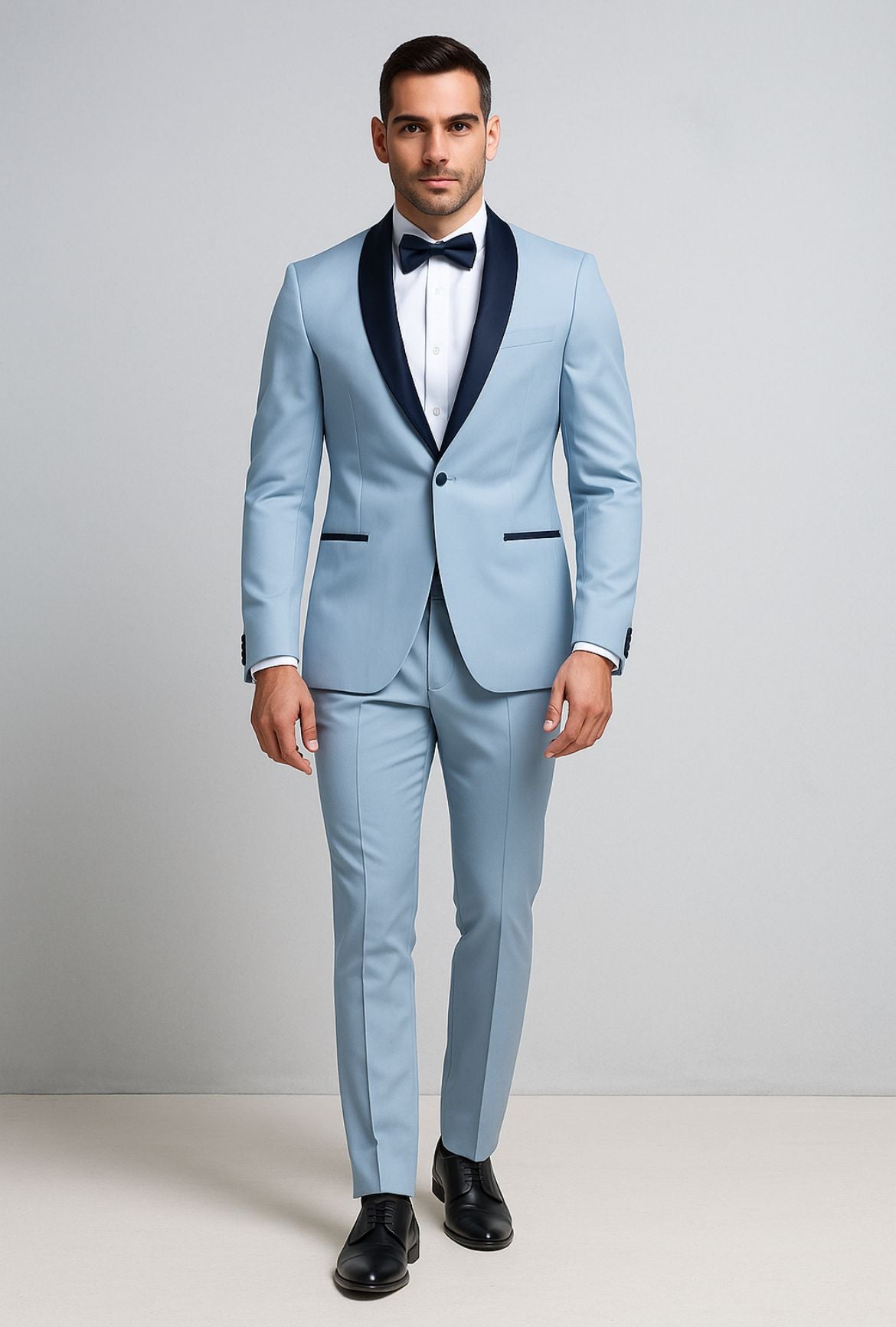 Acquista ora e scopri l'eleganza del nostro abito uomo smoking celeste con rever blu!