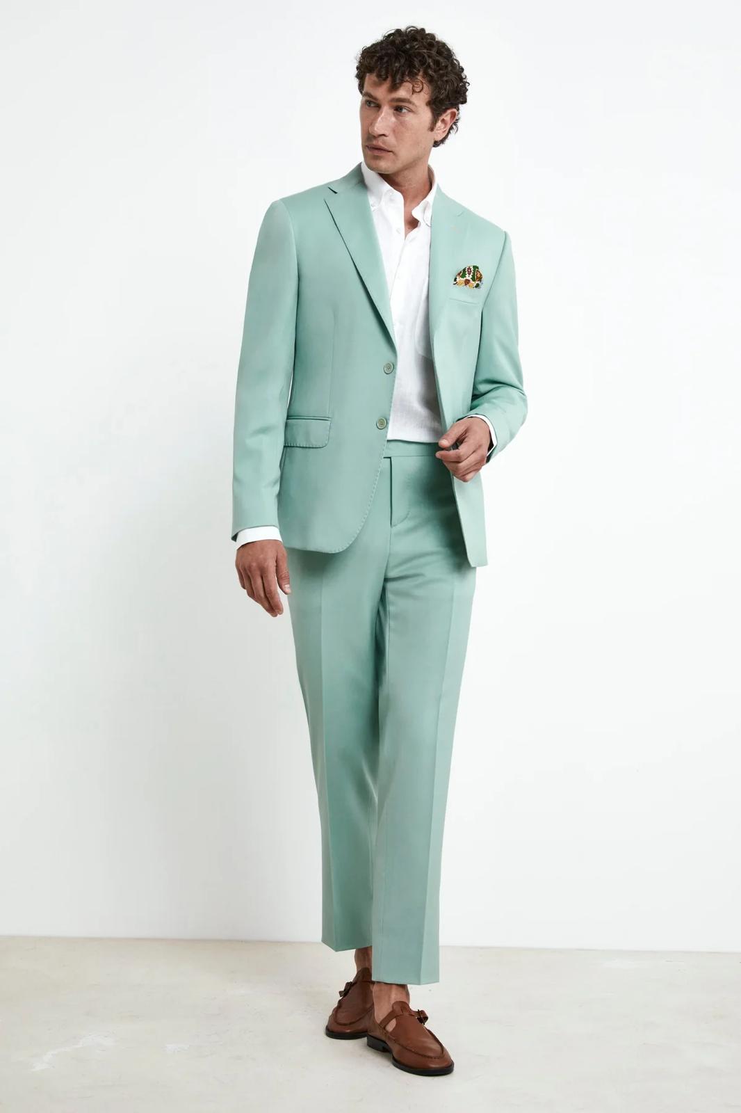 Eleganza disinvolta in chiave contemporanea: questo abito da uomo in viscosa verde chiaro unisce leggerezza e raffinatezza.