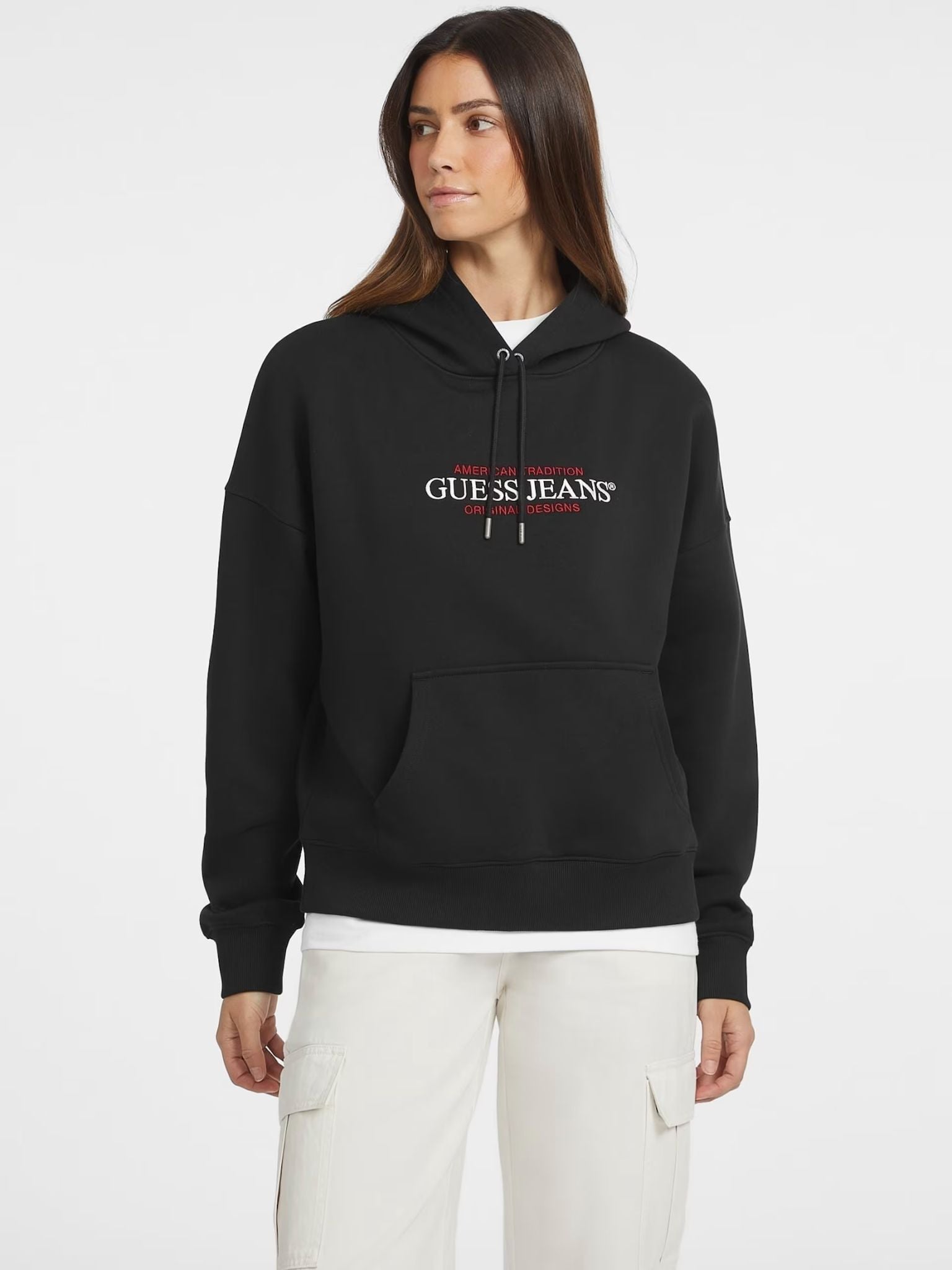 Stile urban con comfort casual. Felpa in maglia felpata, vestibilità oversize con tasca a marsupio e cappuccio con coulisse. Finiture a costine. Il capo contiene fibre di cotone organico.