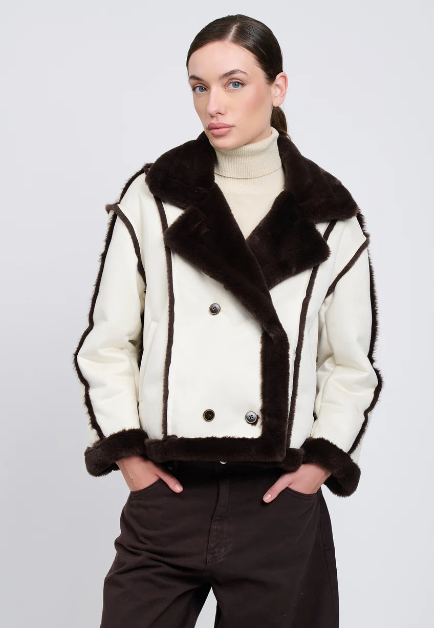 Questa giacca loose fit gioca sui contrasti: un interno foderato ultra morbido in ecopelliccia e un taglio decisamente moderno. Dotata di un'abbottonatura a doppio petto e di colletto rever e profili in ecopelliccia, si presta ad essere indossata nelle giornate invernali più rigide, mantenendoti al caldo con stile.