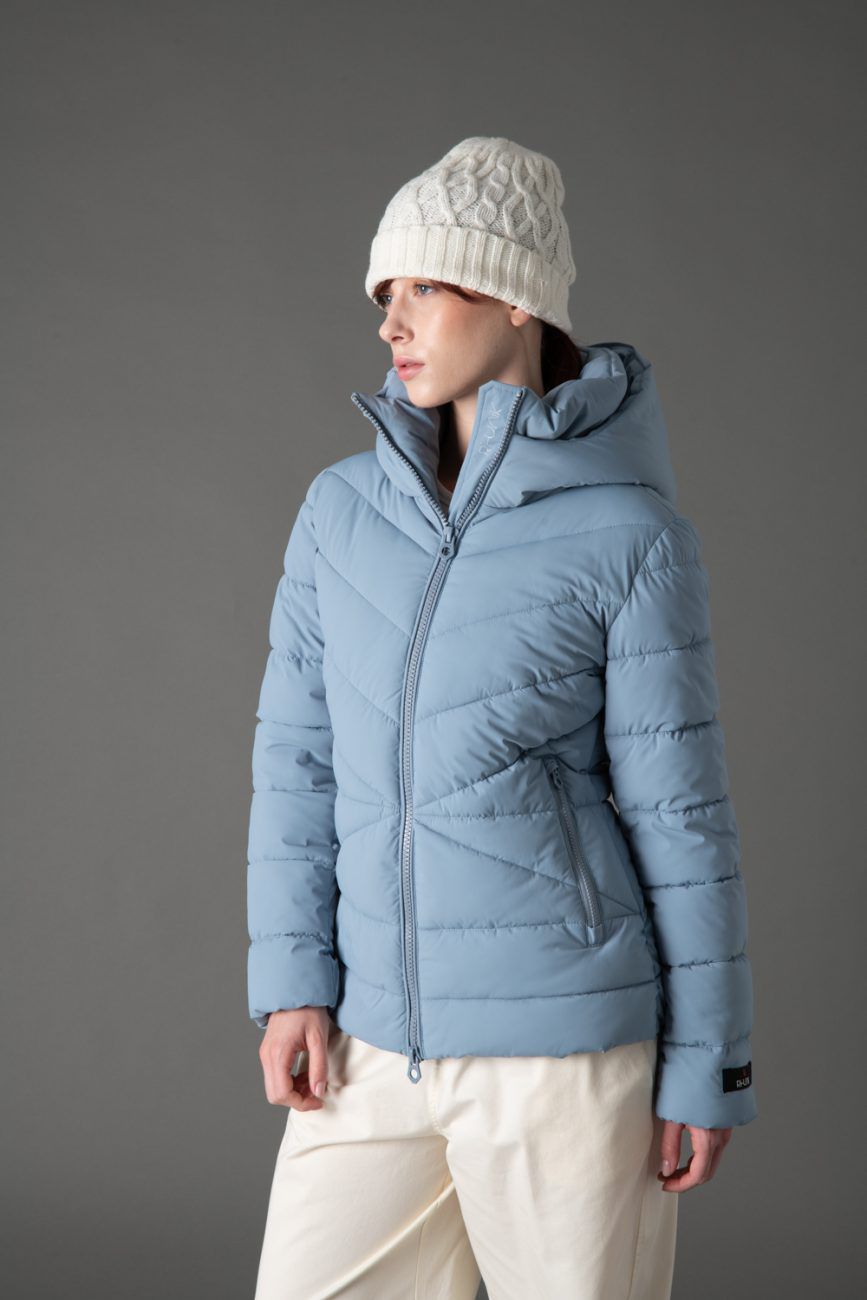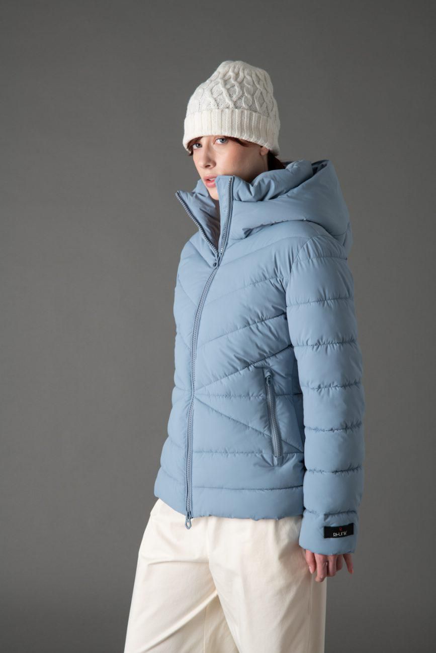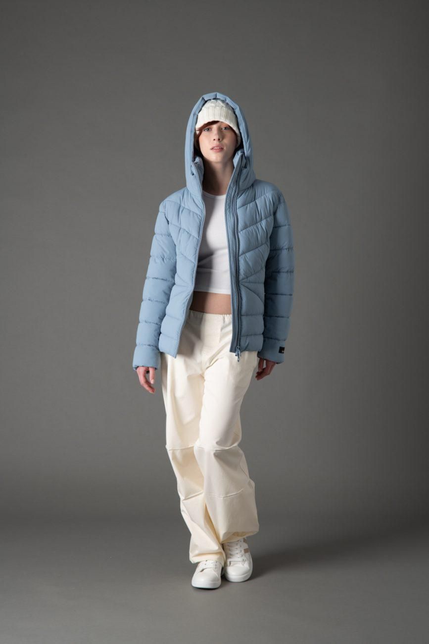 Il design è caratterizzato da impunture diagonali che valorizzano la linea del corpo, mentre il cappuccio integrato offre maggiore protezione nelle giornate più fredde. La chiusura frontale con zip e le tasche laterali lo rendono pratico e funzionale per l’uso quotidiano.