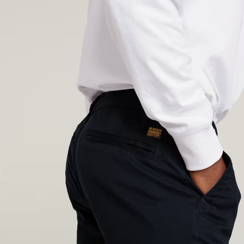 Il modello Chino 3.0 ha una vestibilità skinny. Presenta tasche inserite e tasche posteriori autentiche con doppia finitura a filetto. Questo chino G-Star RAW ha una patta con cerniera.