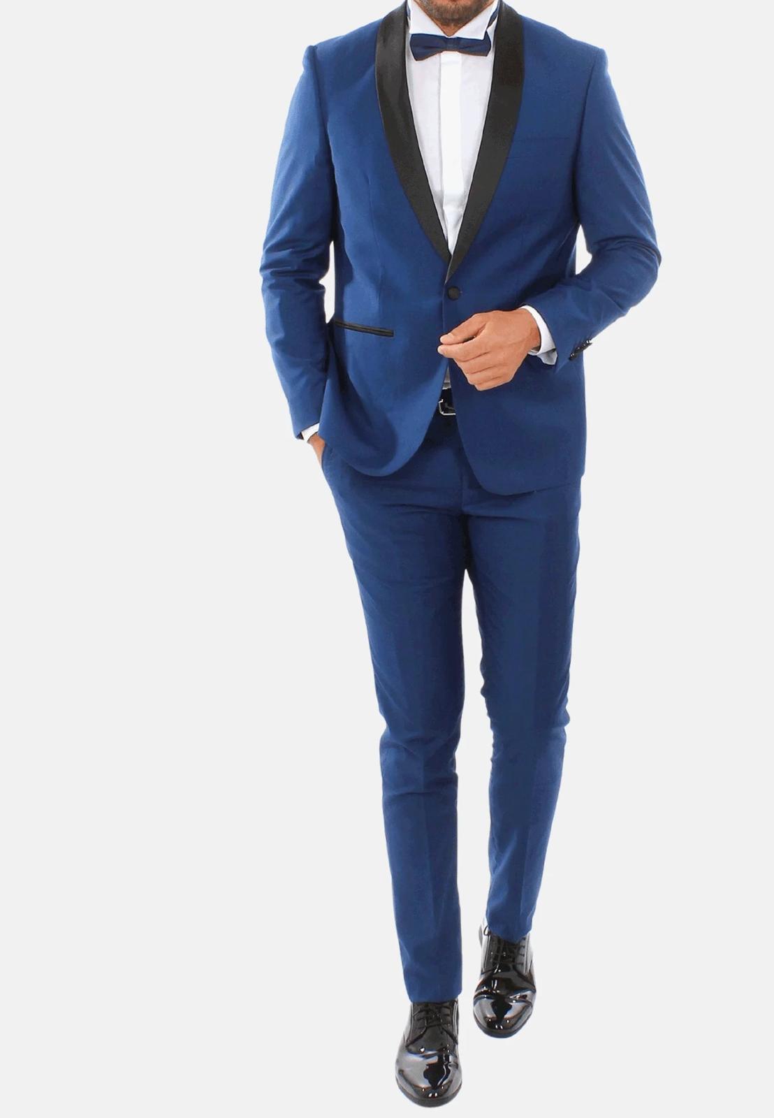 Smoking Blu Uomo con Revers in Raso Nero - Eleganza Moderna per Occasioni Speciali