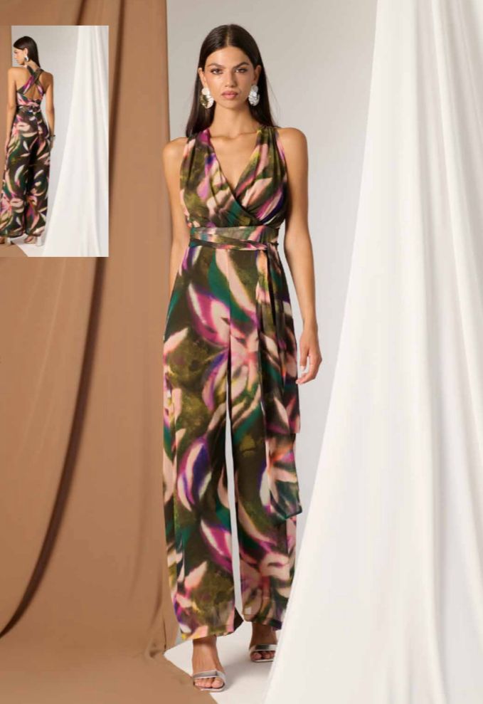 Un capo sofisticato e originale che unisce la freschezza della stampa alla raffinatezza del taglio sartoriale. Questa tuta lunga presenta un elegante scollo a V incrociato che valorizza il décolleté e una cintura in vita che definisce la silhouette. Il motivo floreale astratto nei toni del verde, viola, rosa e avorio dona dinamismo e colore al look, rendendola perfetta per cerimonie, feste o serate estive. Il pantalone ampio e fluido assicura comfort e movimento, mentre il retro con spalline incrociate aggiunge un tocco moderno e sensuale.